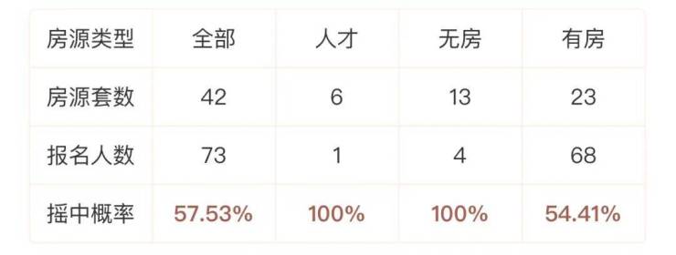 最终,42套房有73组登记,其中有房68组,上车概率约二进一!
