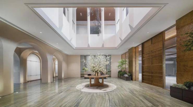 项目东方殿堂级别的公区设计,社区大堂中庭超7米挑空打通双层视野,12座拱形廊柱阵列环抱艺术装置,构成一座雅奢美学殿堂。