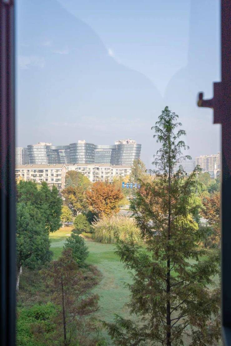 北房间的落地玻璃,窗外秋黄的风景更加壮观,像是一幅巨画,甚至不远处还能看到西湖群山山脉(高楼层会更明显)。