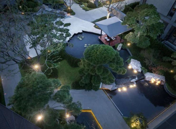 逸庐的景观设计灵感源自豫园,以“亭-桥-溪”为脉络,重构出现代城市里的“新豫园”,呈现一幅可游、可居、可赏的立体山水画卷。