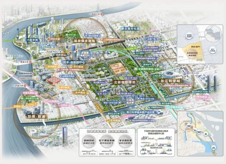 绿城逸庐位于浦东几何中心:背靠北蔡楔形绿地,直连张江科学城,毗邻花木-龙阳路城市副中心。一句话总结——离尘不离城:既是“城市绿肺”,也是“科创心脏”。