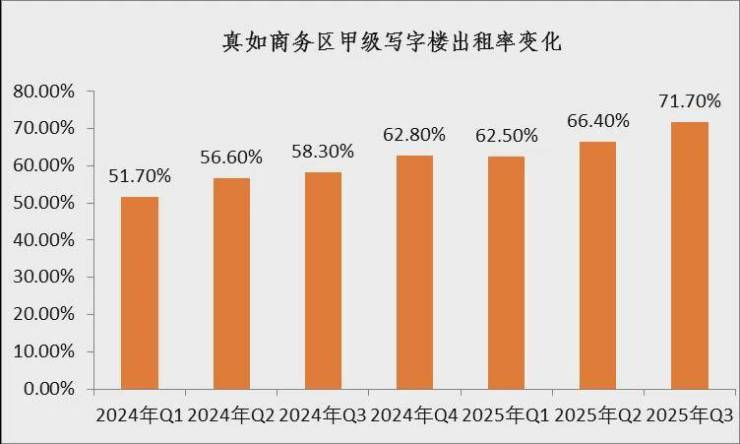 真如商务区甲级写字楼出租率也一路攀升——从2024年一季度的51.7%,提升至2025年三季度的71.7%。这个成绩,对于一个新兴商务区来说,几乎可以打满分。