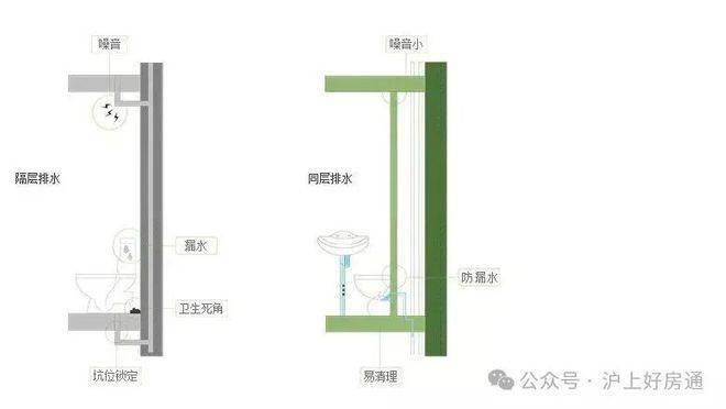 这样的设计大大节约了室内空间、美化了视觉效果,同时消除卫生死角,防止异味。各种管道不穿越楼板,上下住户无干扰,做到静音排水,告别噪声。