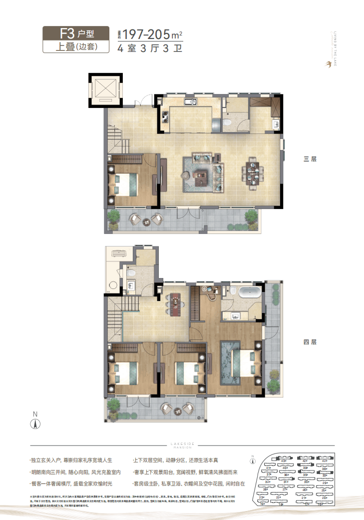 将新亚洲元素植入现代建筑语系,坡屋顶、深挑檐中式元素,采用大面蓝灰色LOW-E玻璃,大面宽、大开间、全明通透的湖景洋房,以“中央空调+新风系统+地暖”全系精装交付,诠释洋房生活的格调。