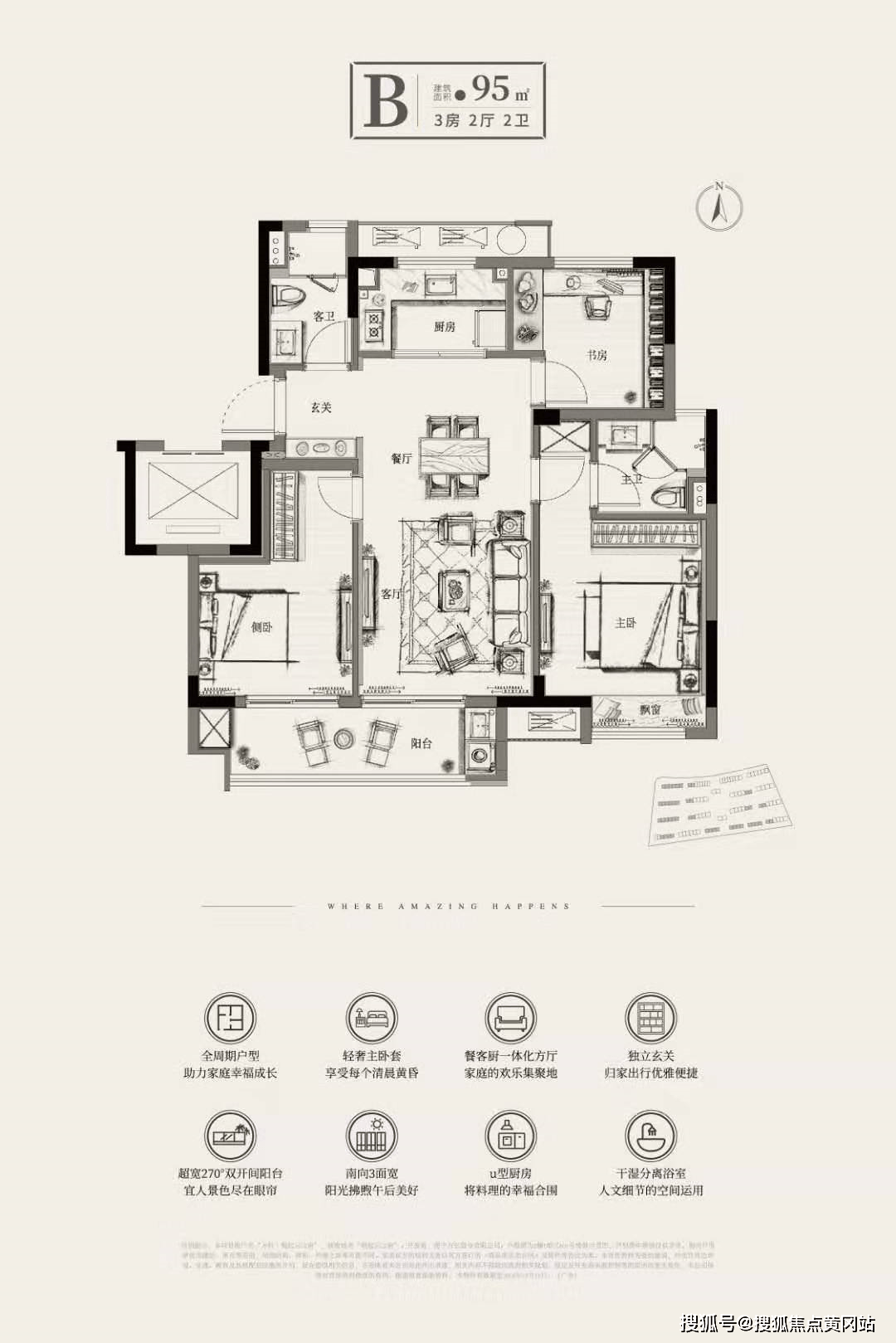 【95方三房二厅二卫】市面上非常罕见的100平以下三开间朝南双阳台且三房两厅两卫的户型,南北通透,采光极好。