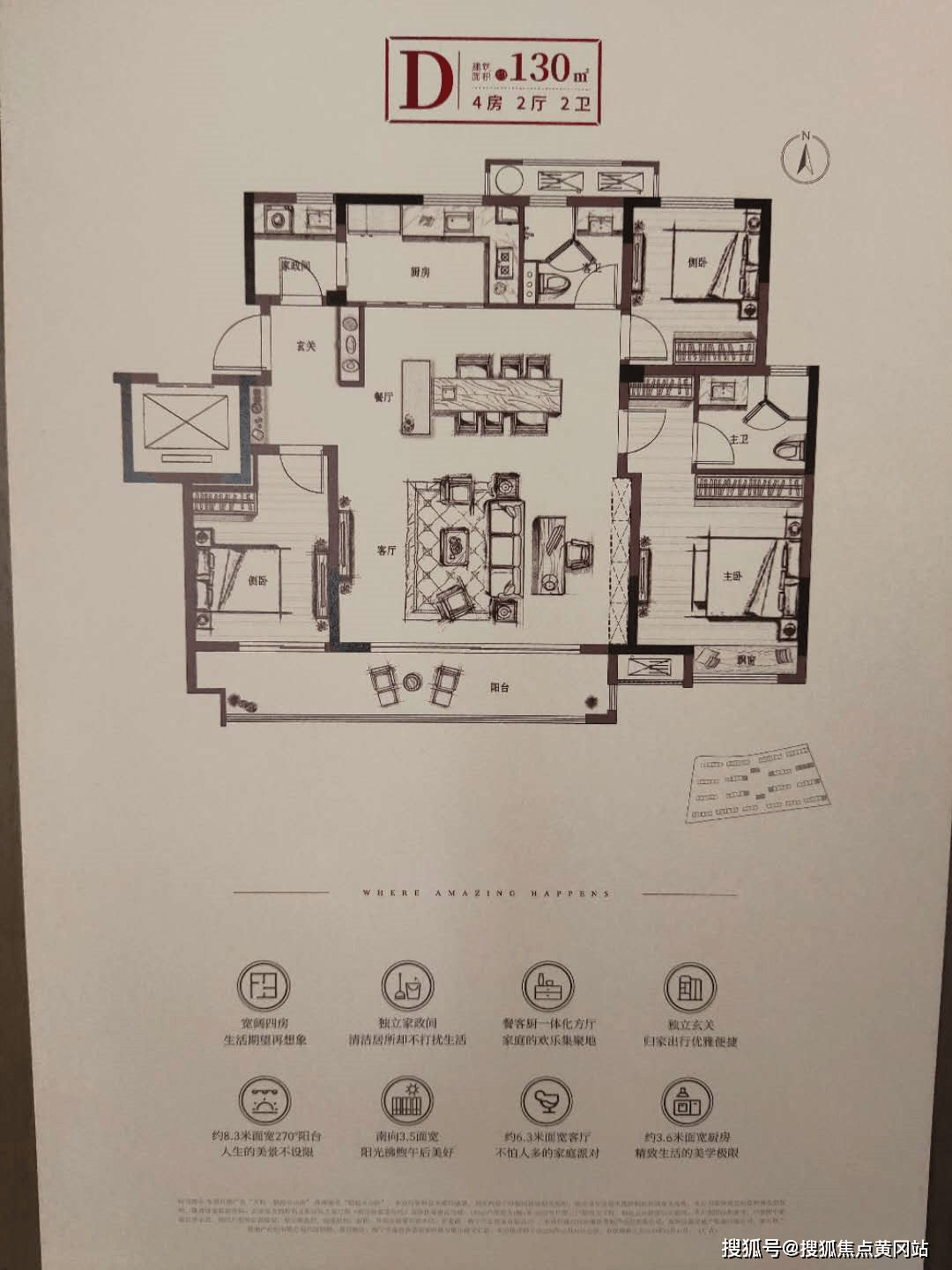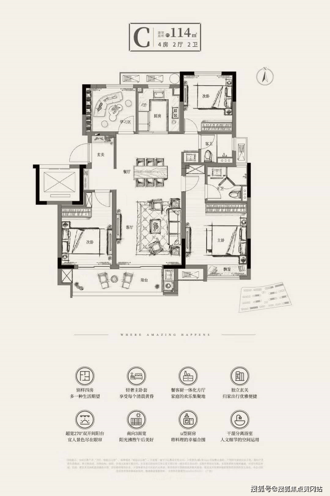 【114方四房两厅两卫】市面上稀缺四房两卫的户型,采用H形的户型结构,减少多余的走道面积,使得整体户型空间利用率更高。