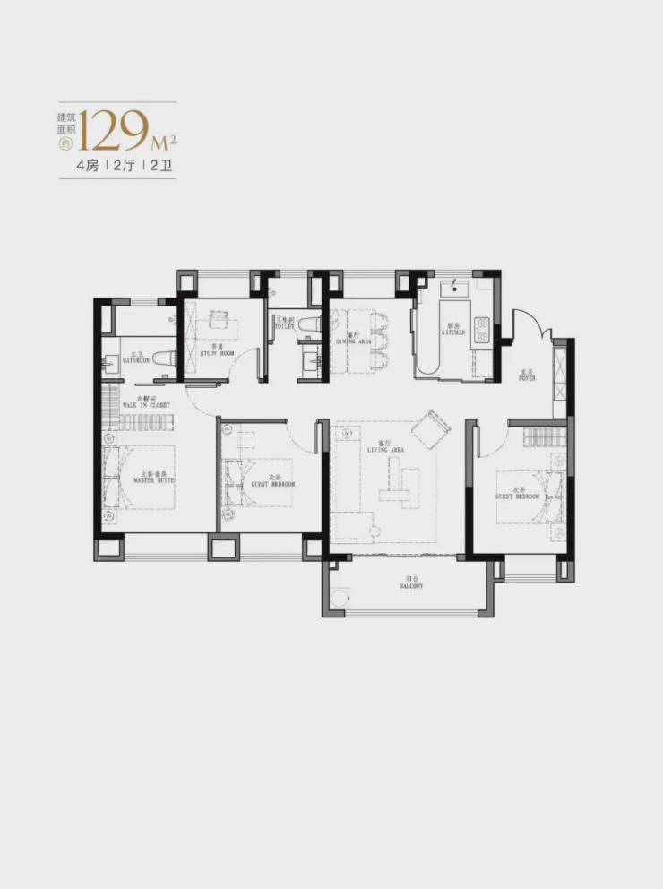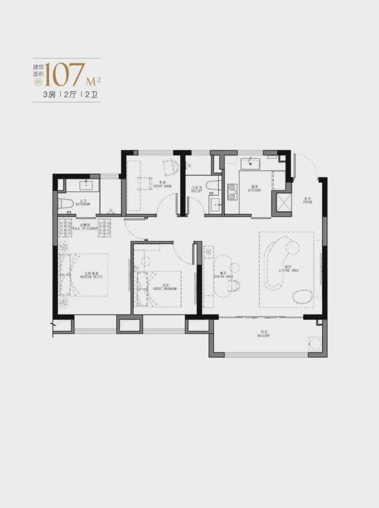 产品:103㎡、107㎡的三房两厅两卫及123㎡、129㎡的四房两厅两卫。