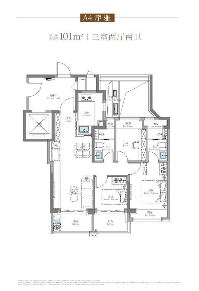 三阳台+环幕飘窗:建面约115㎡户型采用三阳台设计,270°环幕飘窗提升采光与视野