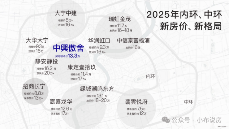万科中興傲舍从上一次开盘至今,市场变化很大,新房价格疯涨,黄浦豪宅全线迈进20万/平;内中环徐汇滨江飙到19.5万/平,与项目同纬度的虹口内环冲击18万+/平;甚至不少内中环项目要卖到14-16万/平。(来源网上房地产以及楼板价倒推)
