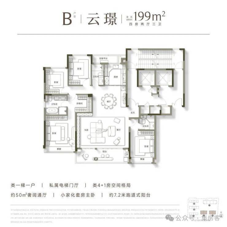 高层均为建面约199㎡的大平层户型,极致纯粹的业主圈层,带来更为尊贵的居住体验。其户型设计尽可能扩宽南向开间的同时,展现出了极为阔绰的空间尺度,足以满足多代同堂的居住需求,成为众多购房家庭终极改善的首选。