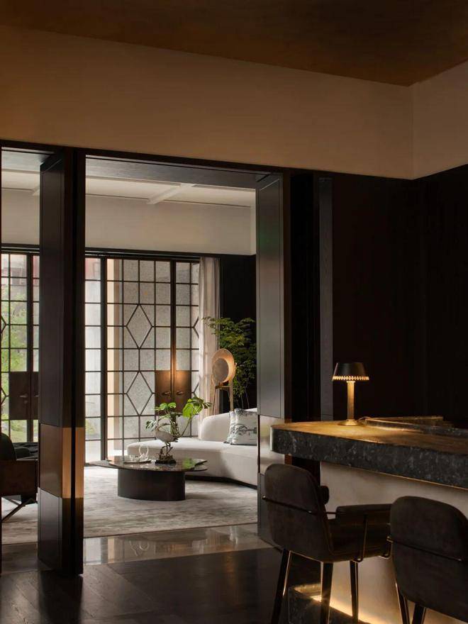 主人轻引客人入内,画屏层层展卷,墨绿色楼梯静卧其间。一座现代主义的雕塑,在东方的游山中,蜿蜒而上,凭栏相望,指引着未知的远意,引发内心深处的共鸣。在这熟悉的空间中,我们得以重新寻求 “人”、“物”与“空间”的连接,审视那些平日被忽视的细节和微观关系。