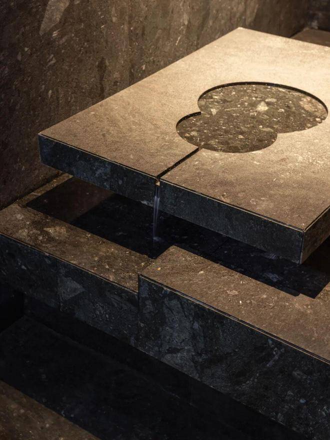 书中自有黄金屋,山水为重屏,金箔覆方顶,时光在其中静静雕琢,凝结出一座“黄金书屋”。也暗合了露香园非遗顾绣的文化传承。当视线聚焦于中央悬浮的一方洞石,古物静穆相对。于是,二者之间便产生了历史的流动与连接。