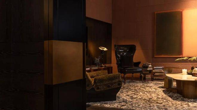 我们时常需要某一瞬的宁静,去释放身体与记忆中的束缚。酒廊内,光影的温度凝结成历史的肌理,柔和的灯光低语般地照映出材质的细腻层次。Verrerie Des Hanots设计的中古壁灯投射出低沉的光晕,像一缕沉淀的余韵,将时光的回响与记忆的绵延置于一隅。这样的空间,既是栖身之所,又是身心的庇护所,意在唤醒个体对黄金年代的一种隐约共鸣,让人得以脱离当下,心意温存,感怀不已。
