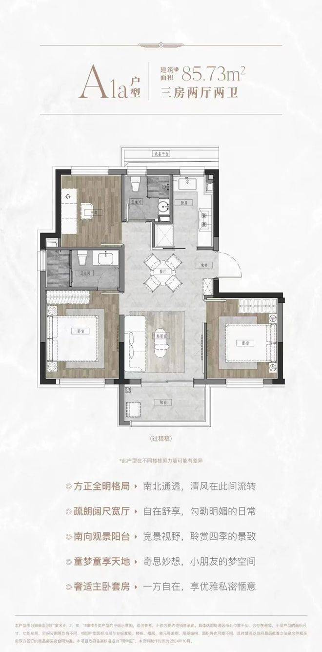 区别于市面上80多平2房或3房1卫,该户型做出了3房2卫的格局,功能性拉满,满足三代同堂/二胎家庭共居。