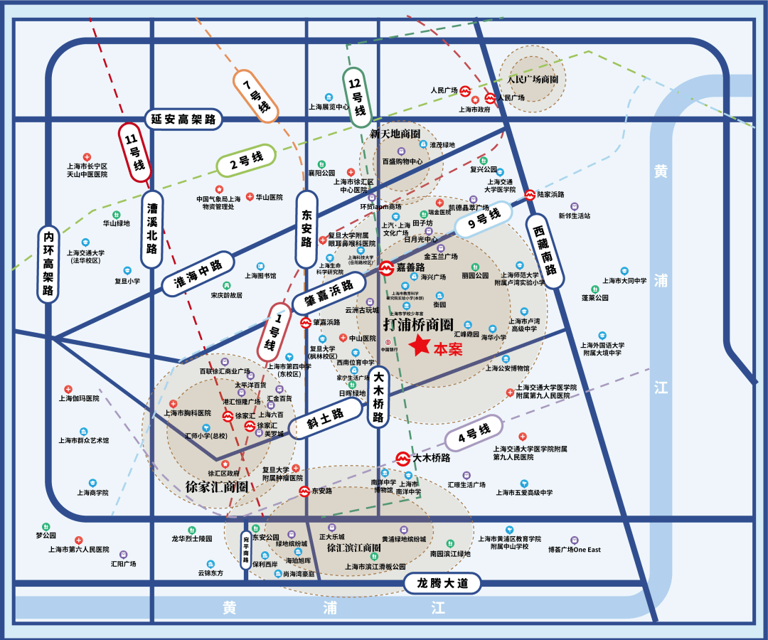 1公里内有打浦桥日月光中心,金玉兰广场,田子坊、正大乐城等商业,2.6公里左右还有绿地缤纷城。