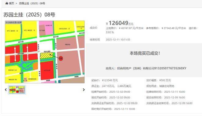 招商湖东8号地块项目,即,苏园土挂(2025)08号地块,位于工业园区钟南街东、苏州大道东南,是2025年12月11日招商以总价126049万元竞得,成交楼面价27342元/平,溢价率2.02%。