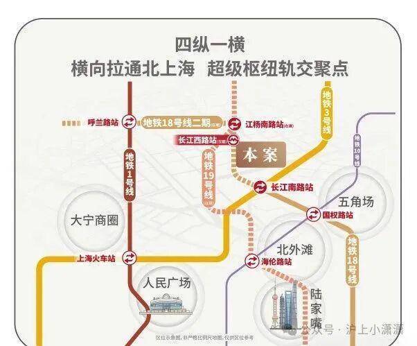地铁18号线横向拉通了原本纵向不相连的四线地铁:1/3/18/19,将北上海横向联通,成为区域轨交的交汇聚点;项目紧邻长江西路地铁站(直线距离约150米),1站江杨南路,5站复旦,7站五角场。
