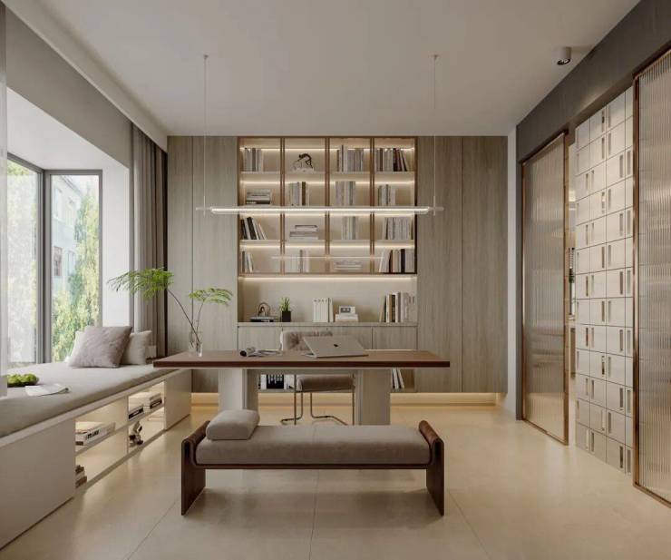 The wall bookcase is matched with a few open shelves, which can not only store books and documents, but also display decorative ornaments to avoid space monotony. A small rest corner is reserved by the window; in leisure time, you can read books and soothe your body and mind here, making the study not only an efficient office space, but also an exclusive space for healing and relaxation, perfectly meeting the owner's dual pursuit of comfort and style.