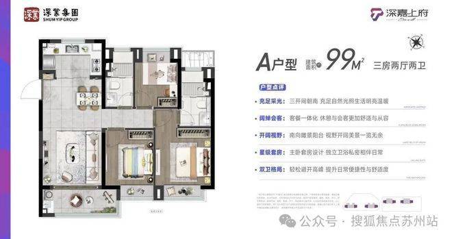 建面约99㎡的三房两厅两卫,很适合一家三口的上车的作品。三开间朝南,南北通透,动静分区,户型非常方正!