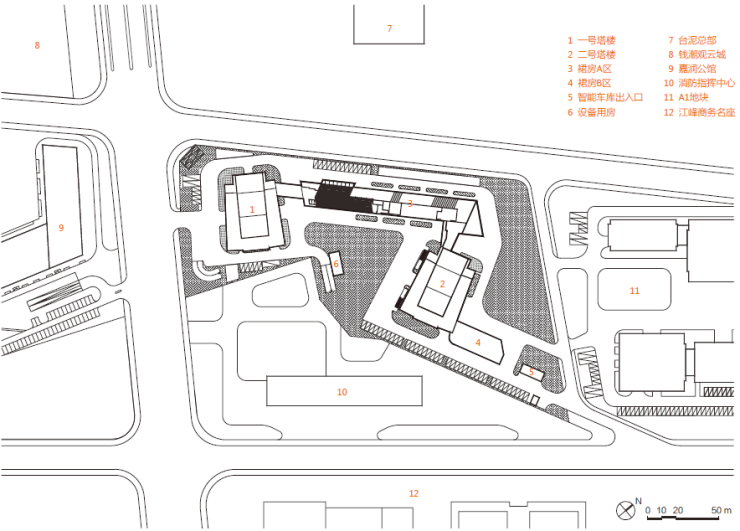 杭州国际办公中心(IOC)由3个地块组成,从东往西依次为A1、A2、A3地块。