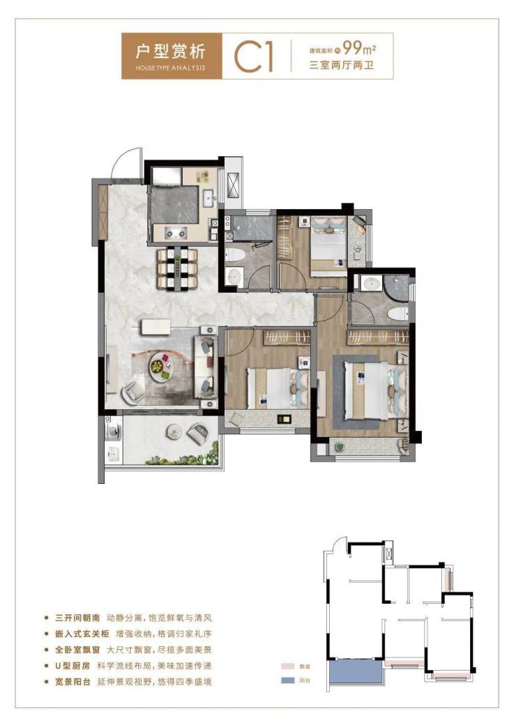 99㎡三房两卫:升级版改善户型,主卧套房设计,配备独立衣帽间,提升居住品质。