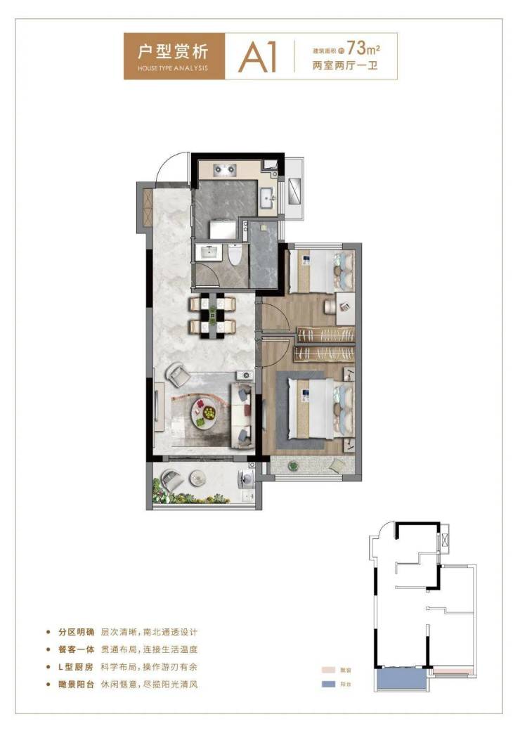 约73平两房户型,南北通透设计,南向瞰境阳台、主卧搭配飘窗,总价控制在200万不到,超低门槛,从容上车;