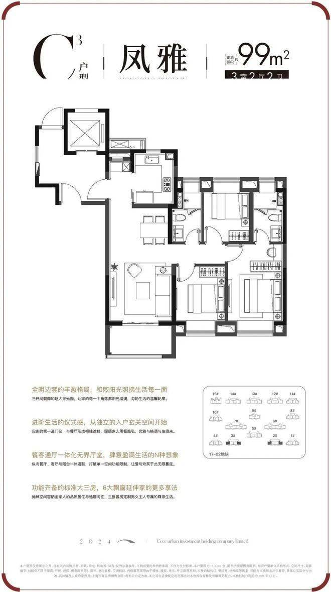 C3户型 | 建面约99㎡3房户型图▼✅✅中交凤启虹桥售楼处电话:400-9016-520✅✅