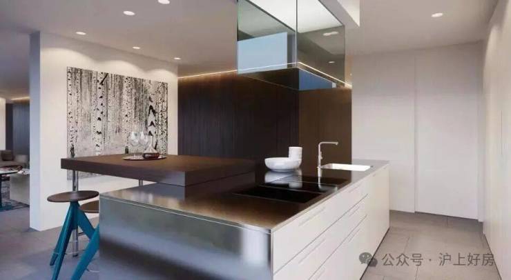 至于厨房, 引进奢华橱柜品牌Bulthaup(巴托普) ,通常来说,汽车原厂漆的烤漆喷涂需11道工序,而Bulthaup橱柜的环保高光烤漆工艺达12道。触感犹如钢琴琴键那般丝滑。