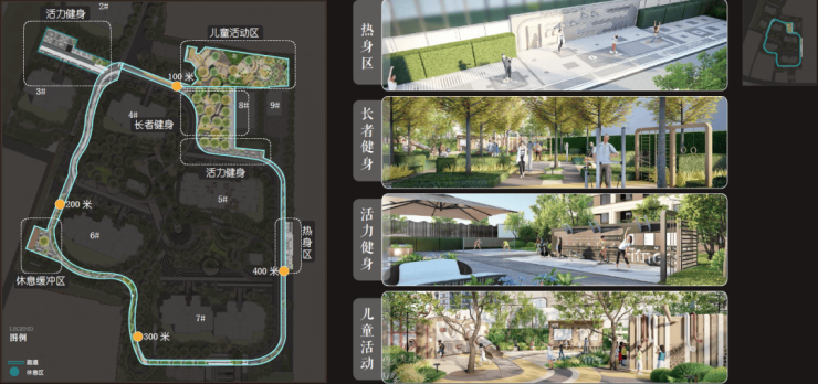 五大运动活力系统: 热身区、定制主题儿童活动区、老年健身区、活力健身区和休憩缓冲区,并由约400M跑道串联