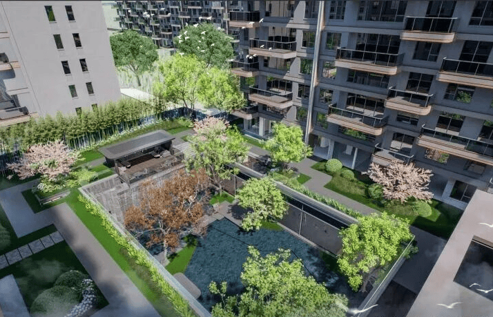 全龄社区配套:约400㎡下沉水庭院、全龄运动场地与林荫健康跑道,形成多层次复合景观架构