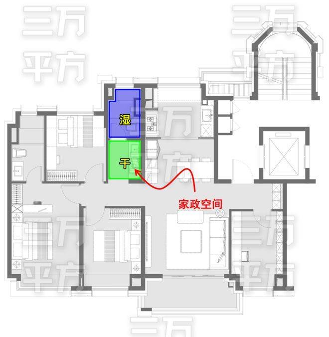 在干区,又很贴心的增加了家政空间!这在功能上布置的太合理了,换洗下来的衣物在边上就能洗涤,便利性一流。
