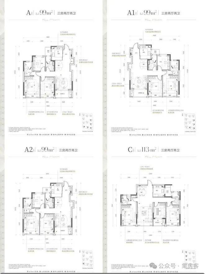 户型设计:建面约99㎡的三房两卫户型,动静分区,采用三开间朝南设计。建面约113㎡的三房两厅两卫户型,四开间朝南,拥有封闭式阳台,南向采光充足,使得整体空间更加宽敞明亮。棠悦芳华轩建面约139㎡生活美学馆