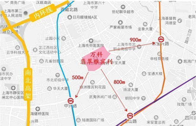 项目距离轨交8号线中兴路站仅500m,两站路即可到达人民广场 ;距离4号线宝山路站约800m,3号线东宝兴路站900米,项目1km距离内拥有3条轨交环绕,出行非常便捷。
