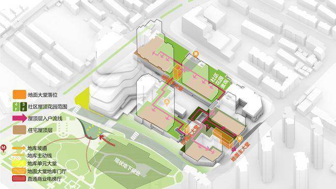 步行体验 为每个人规划不同动线 ; 中興傲舍项目,基于人的关系的角度去设计动线,在高混的业态中,为住宅用户创造私密性和独立性,如到达高线公园这一层都有门禁,只有住户能够抵达,从而将简单的道路线条演变为丰富的空间内容:出与入的记忆、城市与社区的联系、公区与私域的桥梁。
