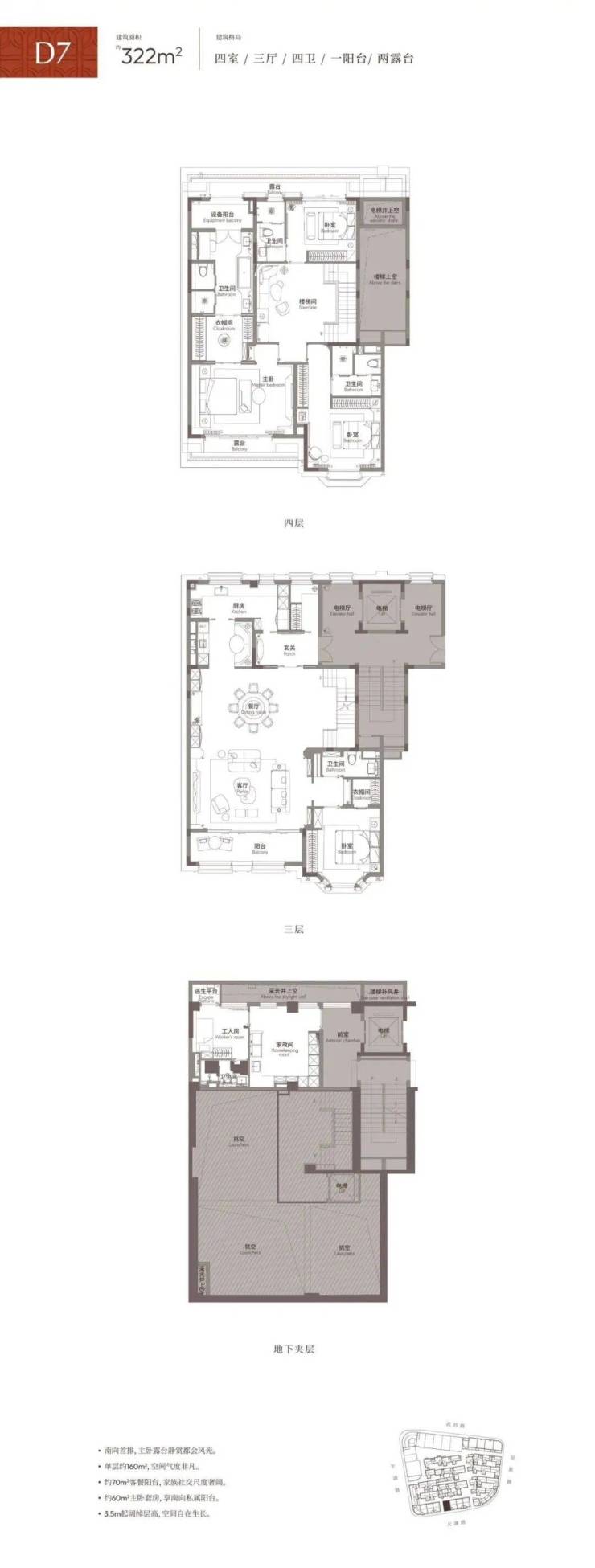 三层约3.5m、四层约3.6m层高,纵向空间感更显阔绰,舒居尺度跃然呈现。