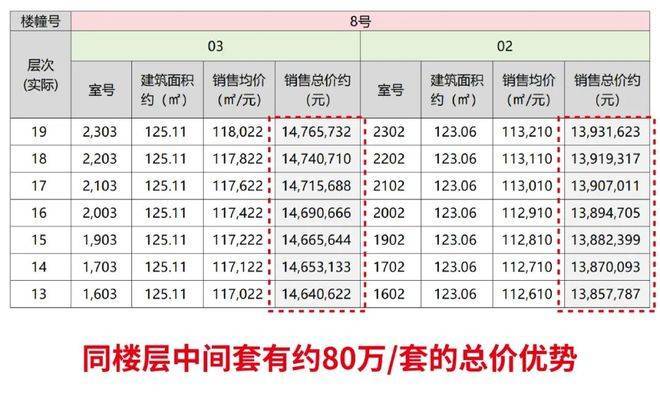 首先,中间套与同楼层边套相比,总价差约80-90万,差额相当于一辆豪车价。