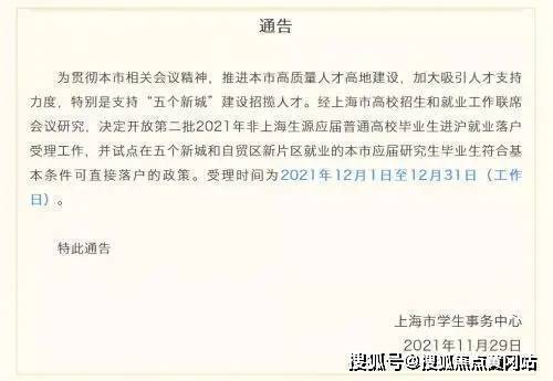 经上海市高校招生和就业工作联席会议研究,决定开放第二批2021年非上海生源应届普通高校毕业生进沪就业落户受理工作,并试点在五个新城和自贸区新片区就业的本市应届研究生毕业生符合基本条件可直接落户的政策。