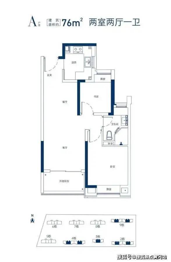 约76㎡的2房是本批次的供应大头。双开间朝南+全卧室带飘窗的设计,保证了室内采光、通风以及视野的优秀。