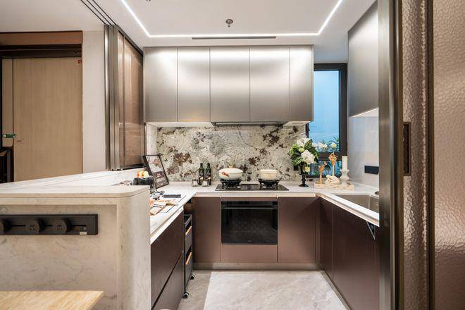 客餐厨顺势衔接、浑然一体,无一丝多余设计,美好生活的理想画卷徐徐展开。窗外高楼林立映江景,涛声阵阵入庭来,在这天然背景中,我们化身生活的主宰,肆意挥洒灵动笔触,为日常添彩。