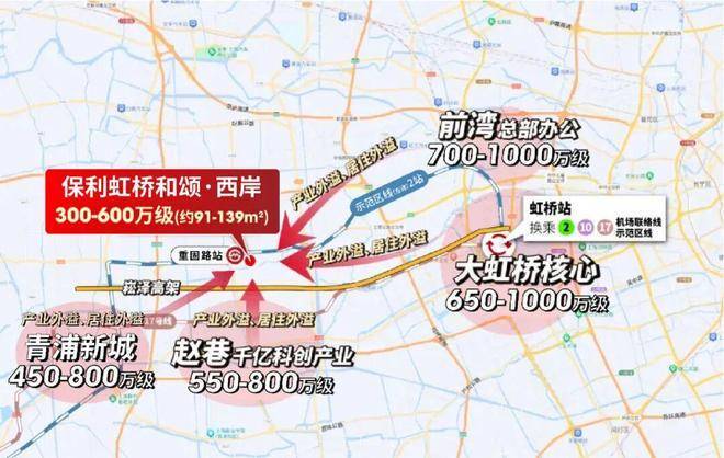 由此可见,示范区线沿线连接着华为、前湾、大虹桥、临空、中山公园、市中心、张江、华泾等一众超强产业区。保利虹桥和颂·西岸凭借地铁房的优势及价格红利,必将成为这些产业区人才置业的热门之选。