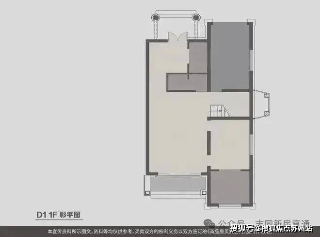 D1型双拼建筑面积:277.08-302.75平米(除6号279.46平米、7号277.08平米、8号281.7平米外,其余皆附带车库);