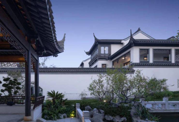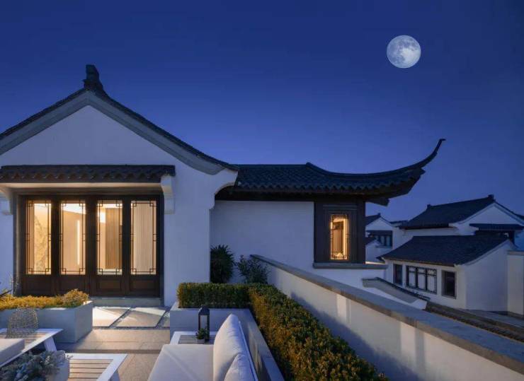 富春玫瑰园中国院子除传承绿城中式产品中的青瓦白墙、飞檐庑廊、影壁漏窗、水榭亭台等中式建筑元素外,为了不辜负从《富春山居图》中走出来的山水大境,在设计上我们还原苏州园林【园院宅阁】体系,极大限度的将富春山水收藏入室。