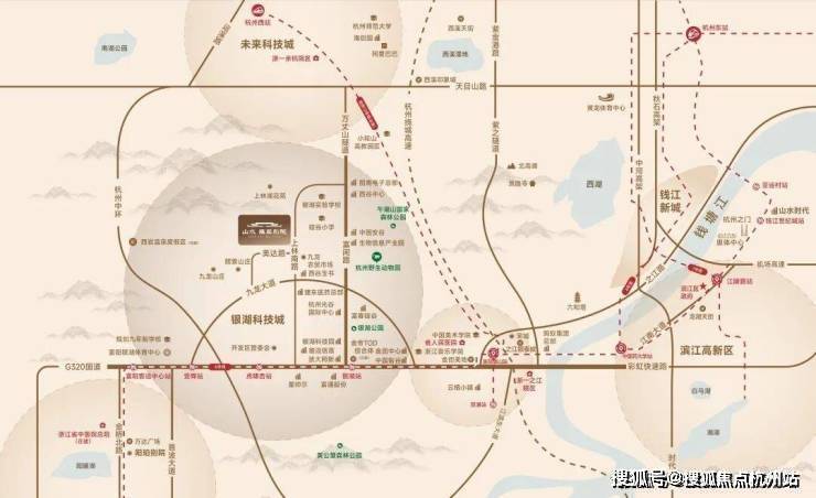 项目位于银湖科技城融杭门户,抢占交通资源高地,约1500米连接杭州地铁6号线虎啸杏站,瞬达杭州主城核芯。毗邻G320国道与彩虹快速路西延段,形成快速融杭交通走廊。