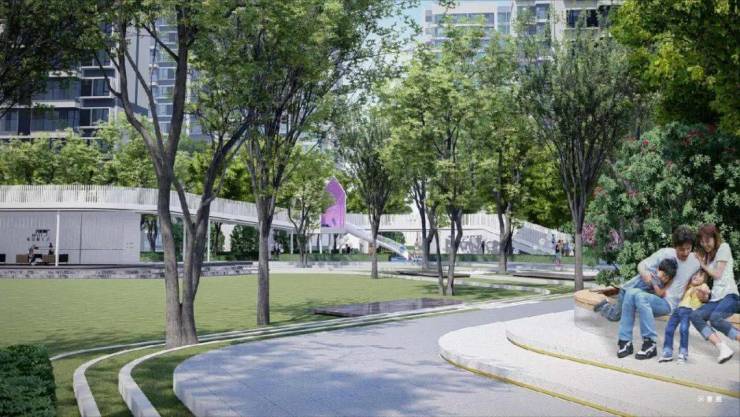 项目景观由上海罗朗设计,打造全年龄段交互式空间布局,中心景观打造下沉式草坪主景。项目景观主题为:一环 两核 两轴 六园: