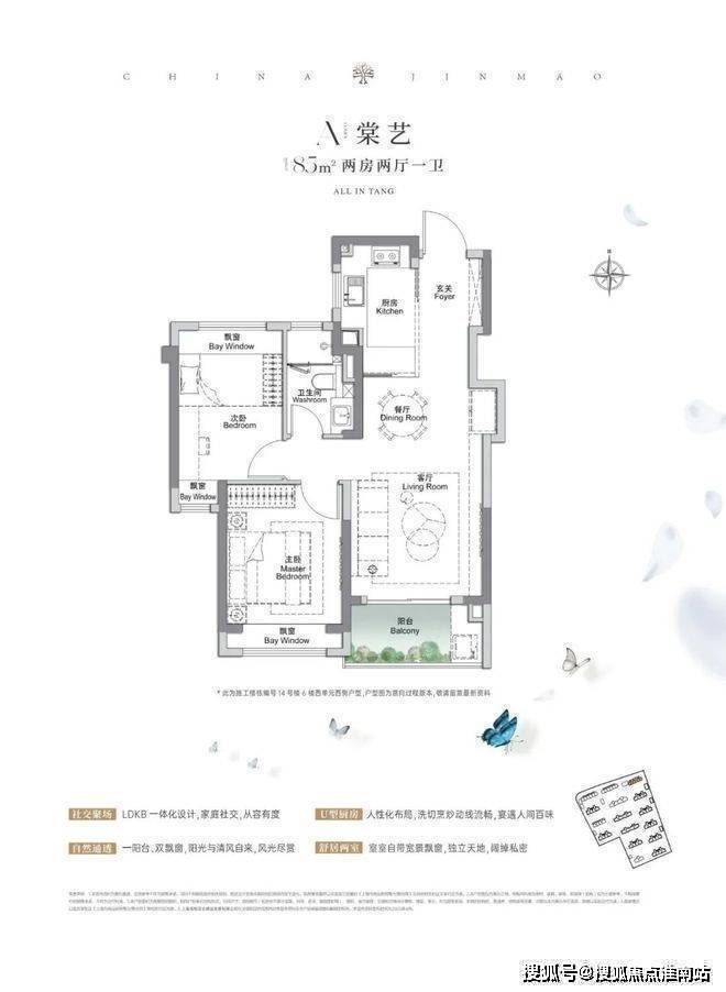 上海宝山金茂棠前营销中心热线4008818994(官方预约热线)建面约85㎡2房2厅1卫,做到了双开间朝南+3个飘窗+LDKB一体化设计,附加空间非常多。