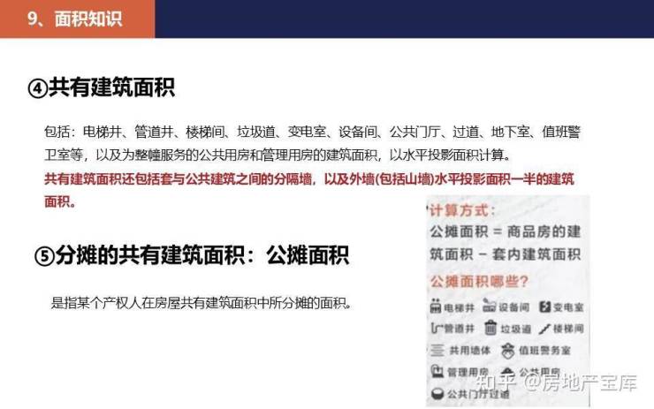 7、公摊面积标准:指商品房销售中应分摊计入销售面积的商品房中公共建筑空间的面积,由两部分组成:一)室内外楼梯、内外廊、公共门厅、通道、电梯、配电房、设备层、设备用房、结构转换层、技术层、空调机房、消防控制室、为整栋楼层服务的值班警卫室,建筑物内的垃圾房以及突出屋面有围护结构的楼梯间、电梯机房、水箱间等;