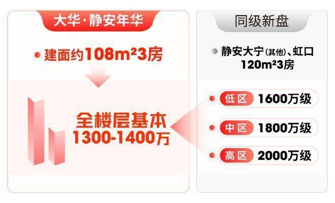 静安大宁、虹口新盘,3房总价约1600万起,若想买中区房源,要到1800万级;而大华·静安年华108㎡3房,全楼层总价基本1300多万,门槛温柔太多。