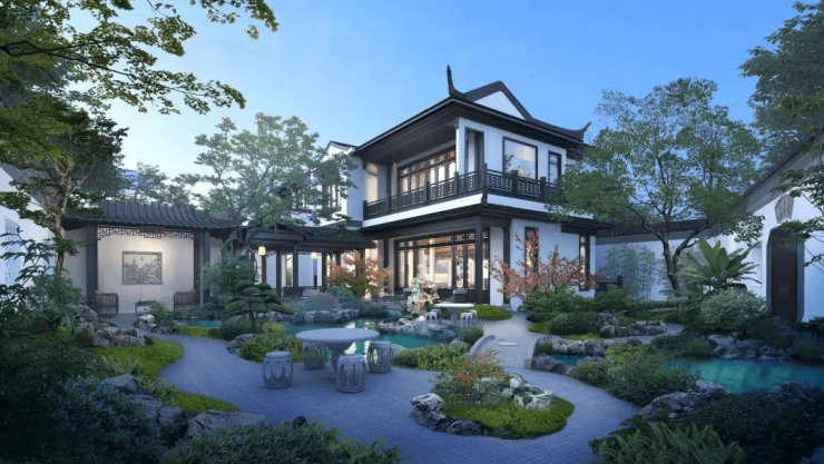 园林则以江南景致为蓝本,汲取古典中式园林的造园手法,将东方庭院的极致之美,发挥得淋漓尽致。