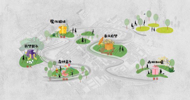 对于社群生活的极致研究,就是对生活美学最高致意。为了营造情绪共鸣的社区空间,我们主张将一种心灵的向往空间、漫生活的主场引入,这一理念,恰巧与丹麦hygge式设计不谋而合。祛除繁琐的空间营造,将安徒生的浪漫风格贯穿整个住区,“森林秘境、乘风启梦 、魔法驿站、筑梦匣子、奇妙盒子”等一系列童话故事融入于景观空间体验中,“一核一环两轴多点”的景观布局就此展开,这种远道而来的生活方式一定程度上,在丰盈着我们日益浮躁的心灵。