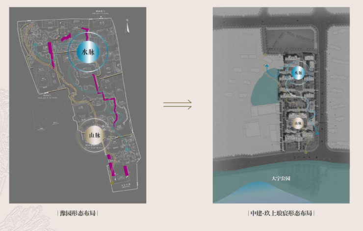 社区内部,设计团队以豫园为灵感蓝本,运用现代手法重新诠释豫园的“山脉”与“水脉”,打造出一座立体起伏的山水园林。